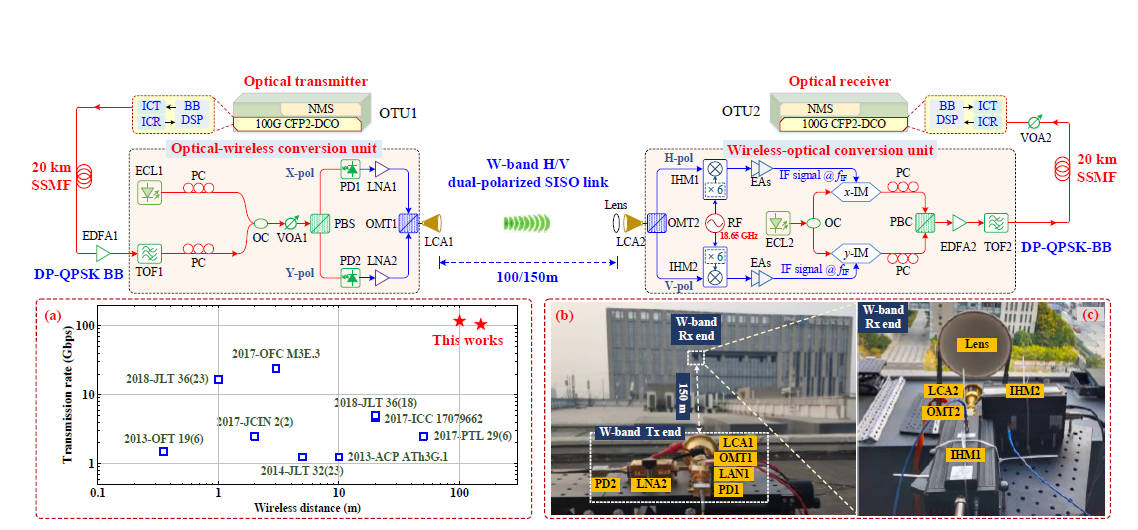 Real-time 100-GbE fiber-wireless seamless integration system using an electromagnetic dual-polarized single-input single-output wireless link at W band